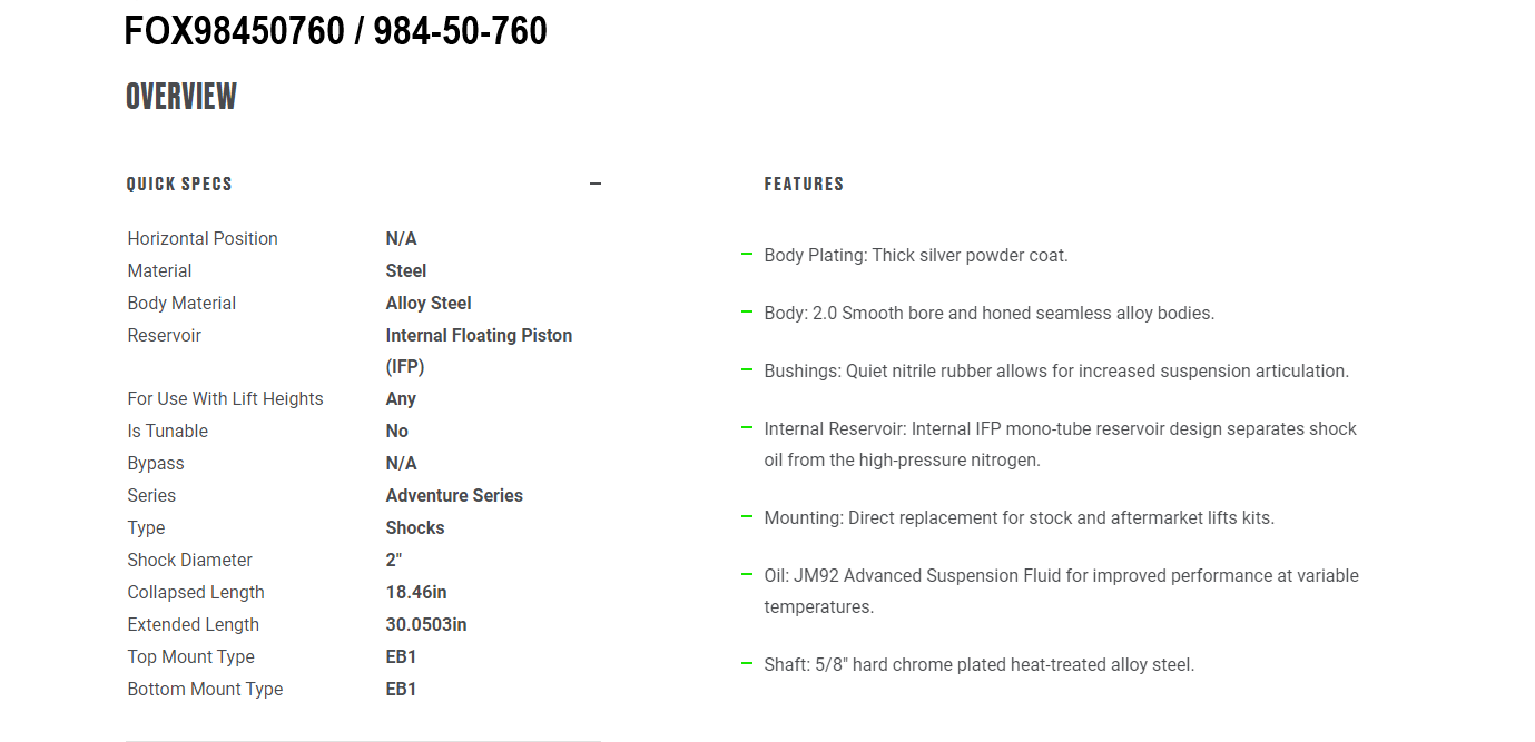 FOX 2.0 ADVENTURE SERIES SMOOTH BODY IFP SHOCKS | 984-50-760Manufacturer: Fox ShocksPart # FOX98450760 / 984-50-760...