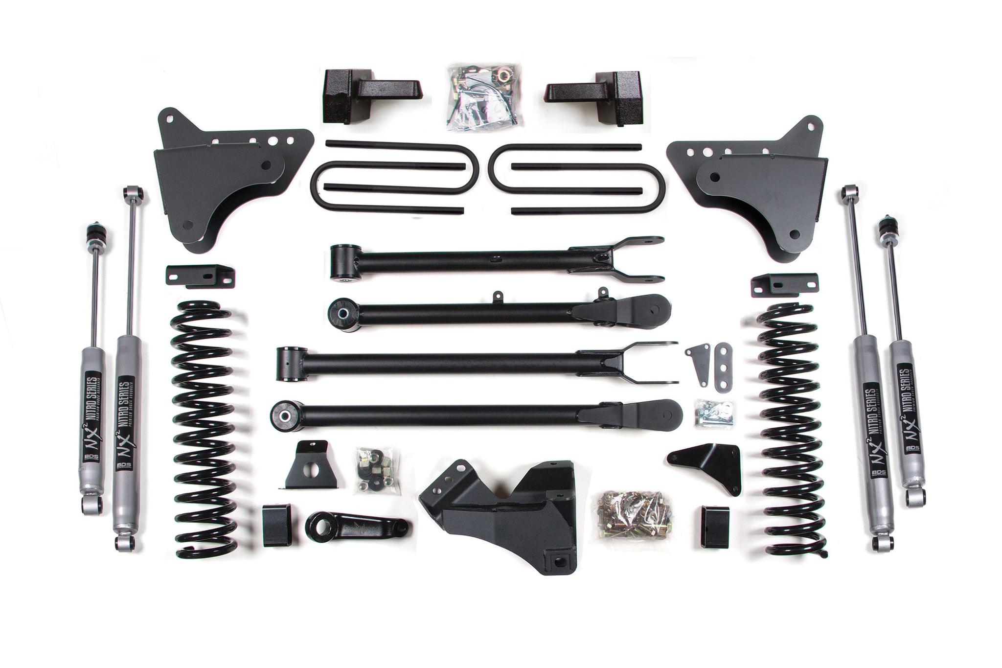 Convert the factory stamped steel radius arms over to the BDS 4-link to optimize suspension geometry for better handling characteristics while adding strength and stability. This bolt-on upgrade utilizes high-strength ¼-inch steel brackets that allow mounting of HD upper and lower control arms to correct axle positioning while limiting caster change throughout wheel travel.