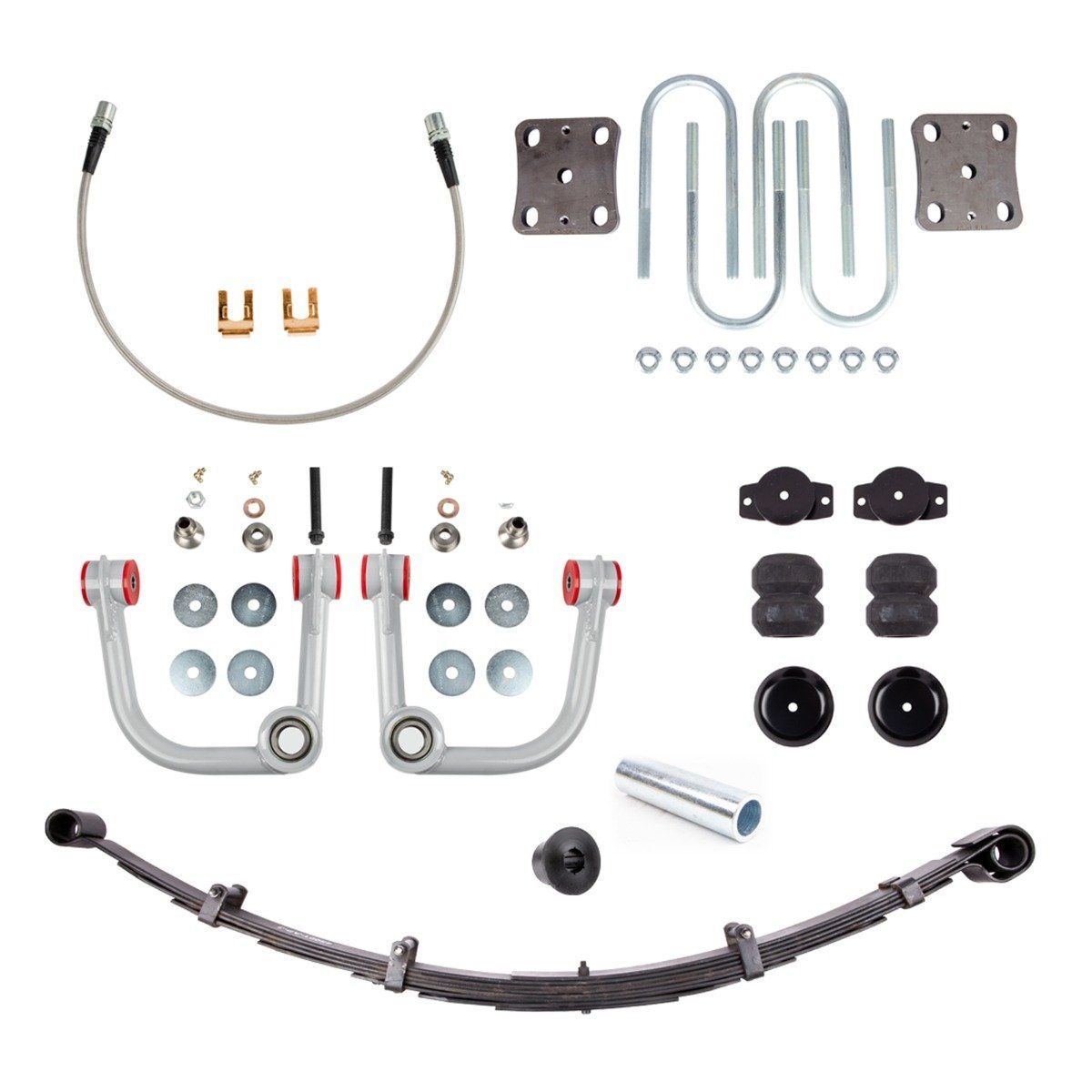 Save time and money by purchasing our full all-pro suspension kit. Our All-Pro Suspension Kit w/o Shocks is intended for those who plan on using adjustable coil-overs and need to compliment them with a rear spring lift and adjustable control arms. Choose between Standard and Expedition leaf springs. Optional bumpstops are available.